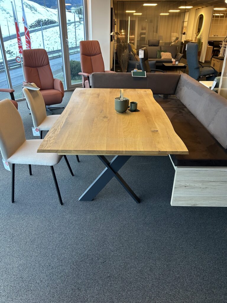 Tisch in astiger Eiche massiv geölt (Quercus / Polen), Waldkante 2-seitig, Plattenstärke 26 mm, Gestell Stahl schwarz, B 100 x T 180 / H 76 cm