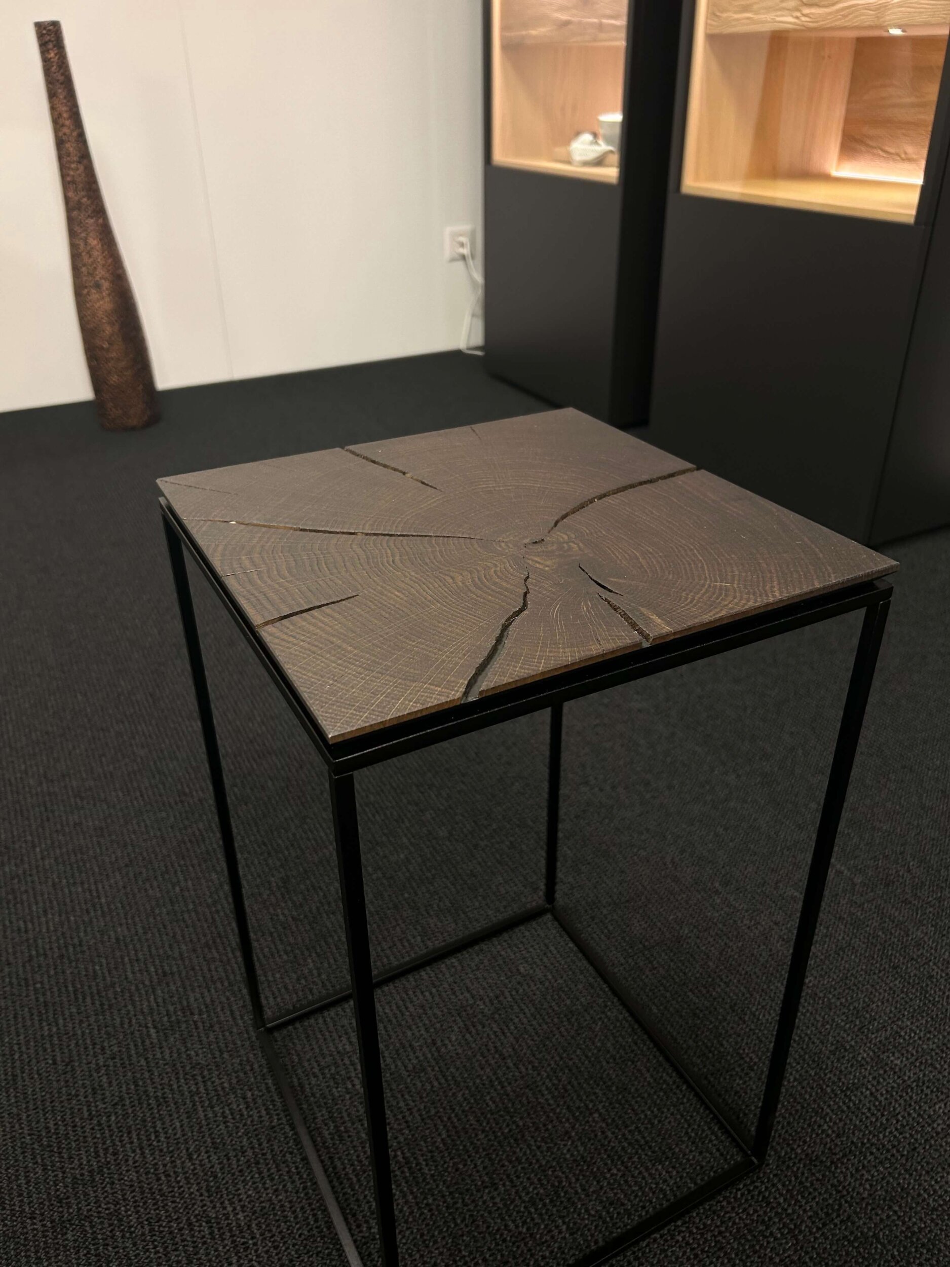 Beistelltisch, Hirnholzplatte Eiche geräuchert(Quercus robur / Deutschland), Trägerplatte MDF schwarz, Metallgestell Quadratrohr Stahl schwarz gepulvert, B 30 x T 30 / H 52 cm
