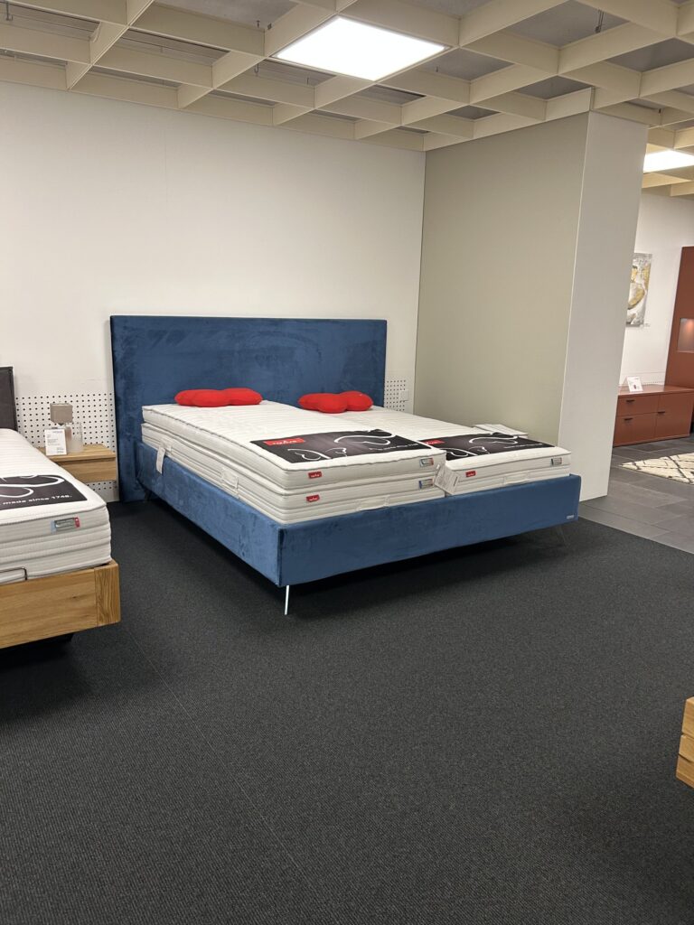Polsterbett in Stoff Velours blau, Metallfüsse chrom glänzend, Kopfteil leicht verletzt, Liegefläche 180 x 200 cm (ohne Bettinhalt), ca. B 210 x T 212 / H 121 cm