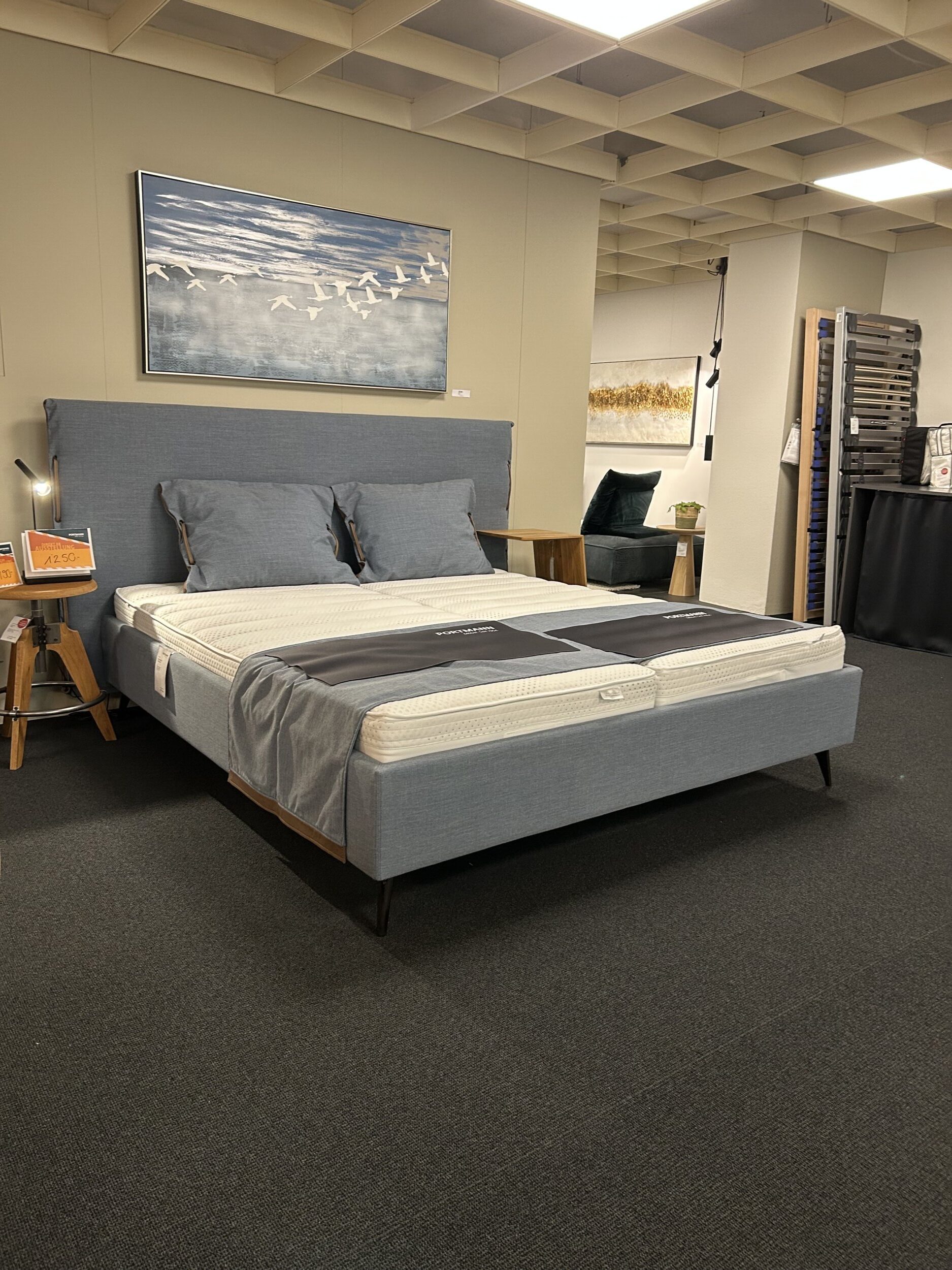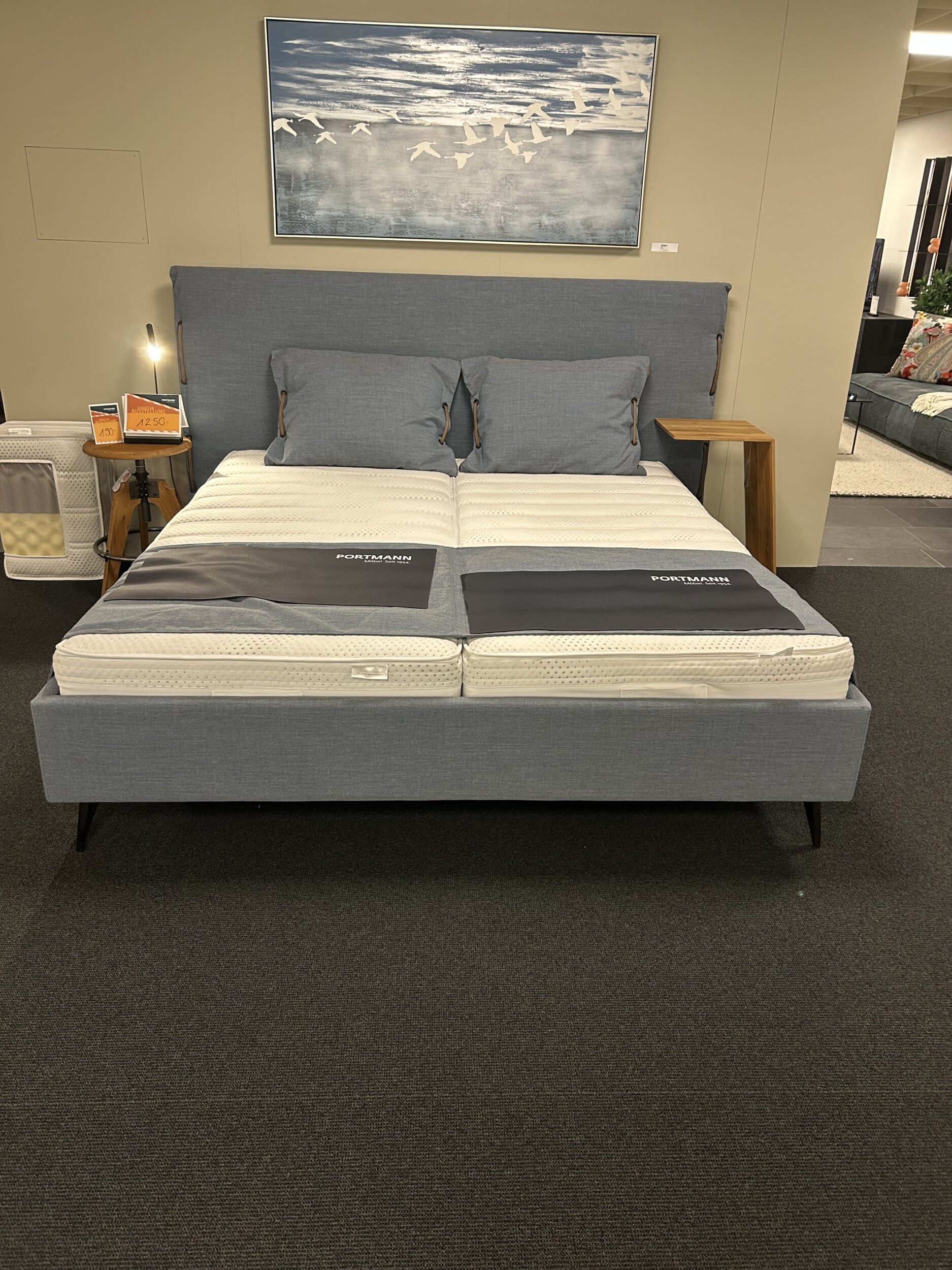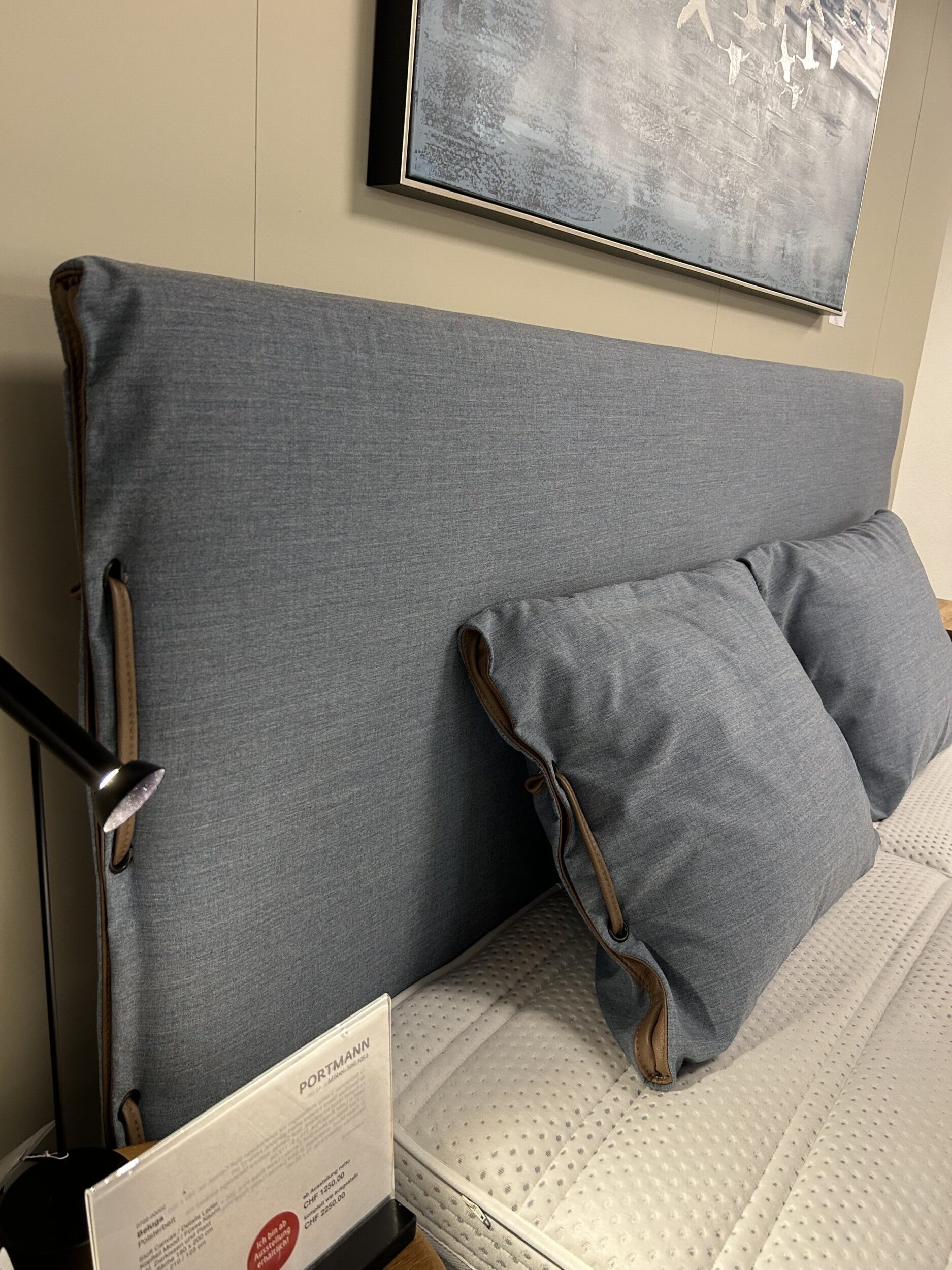 Polsterbett in Stoff blau, Details mit Metallringe in schwarz und Leder braun, Metallfuss schwarz poliert glänzend, inkl. Zierkissen und Plaid, Liegefläche 180 x 200 cm (ohne Bettinhalt), ca. B 218 x T 210 / H 123 cm