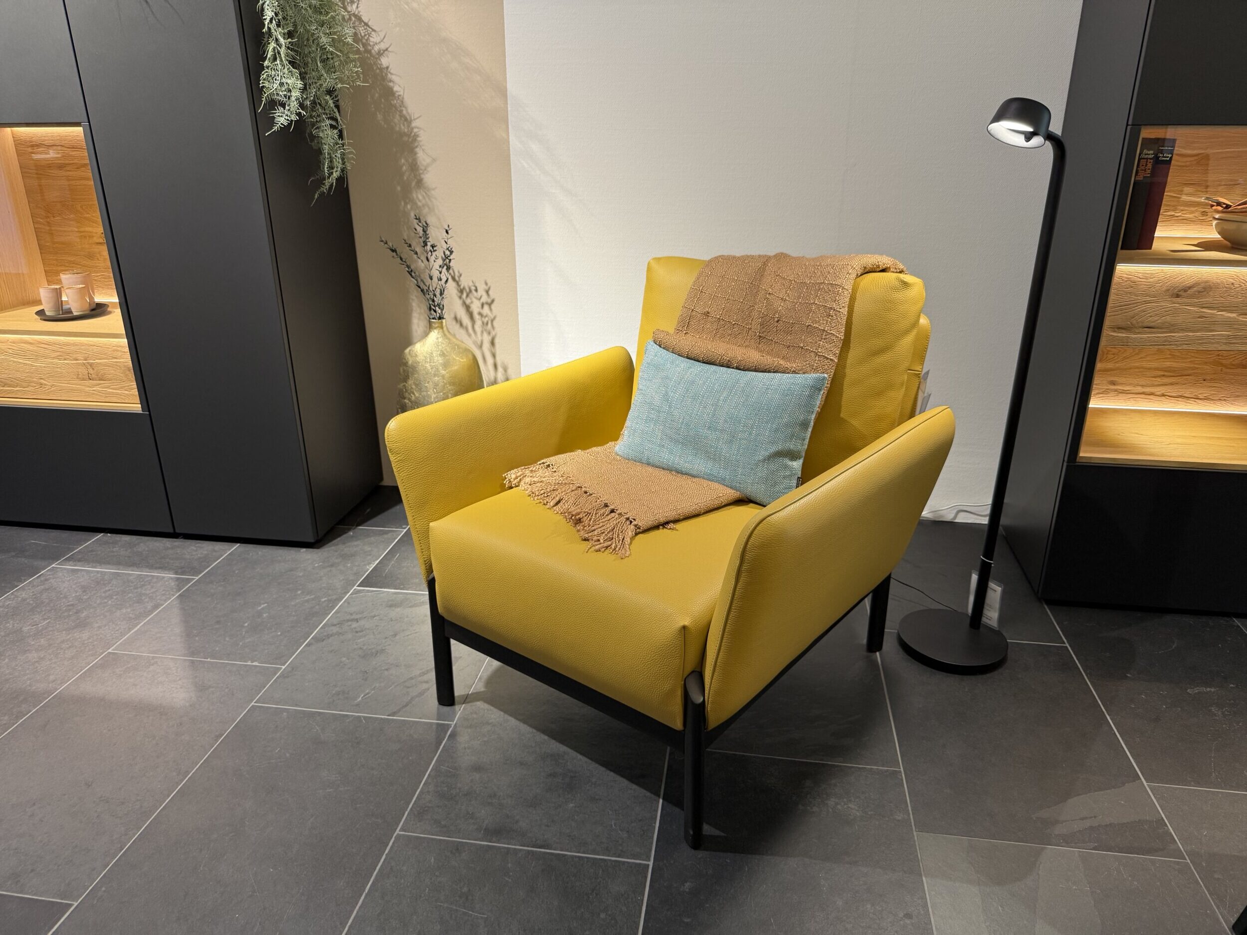 Sessel in Echtleder gelb, Füsse Epoxy Nuit Silk, Sitzhöhe 40 cm / Sitztiefe 57 cm, B 80 x T 85 / H 80 cm