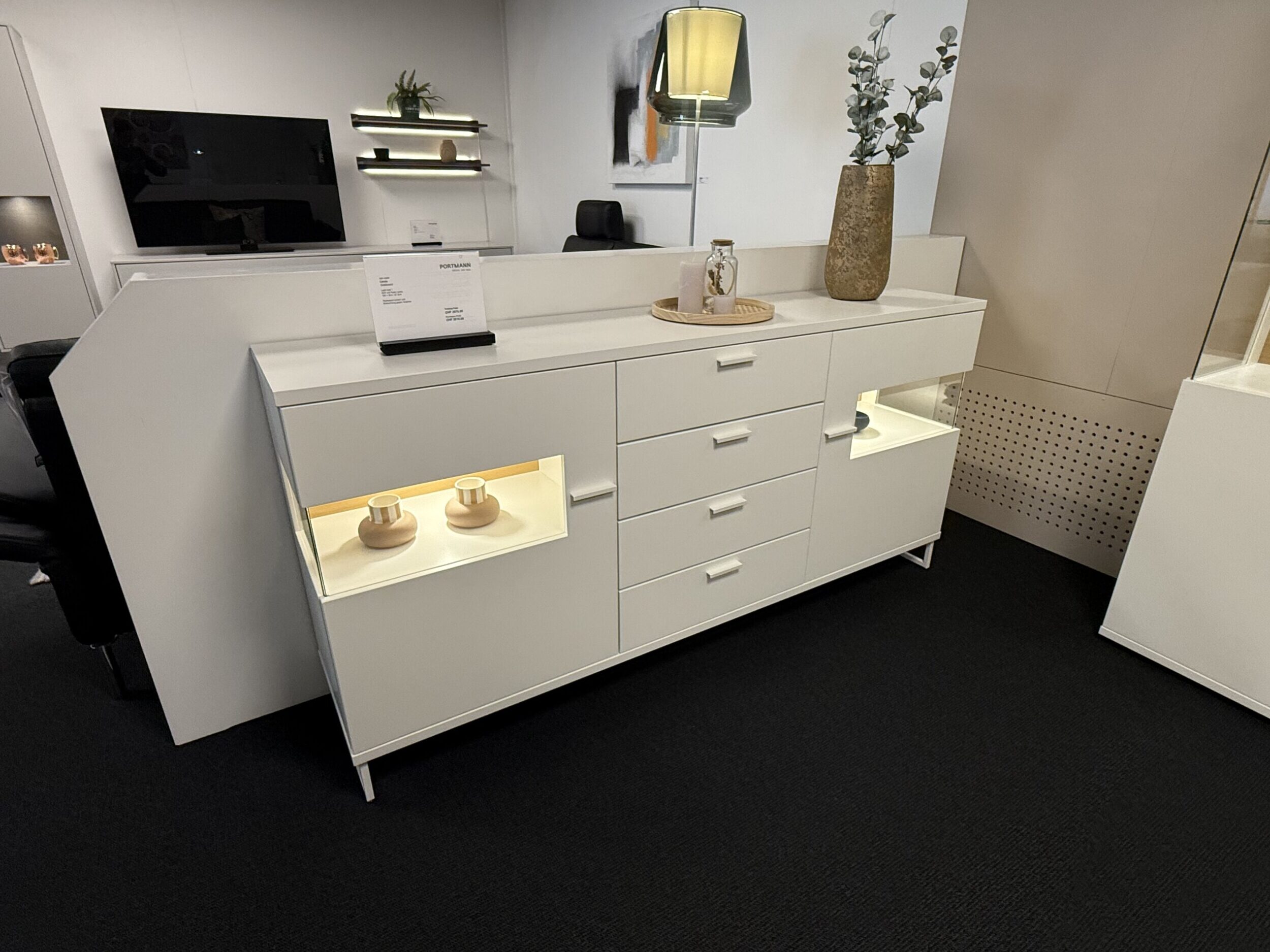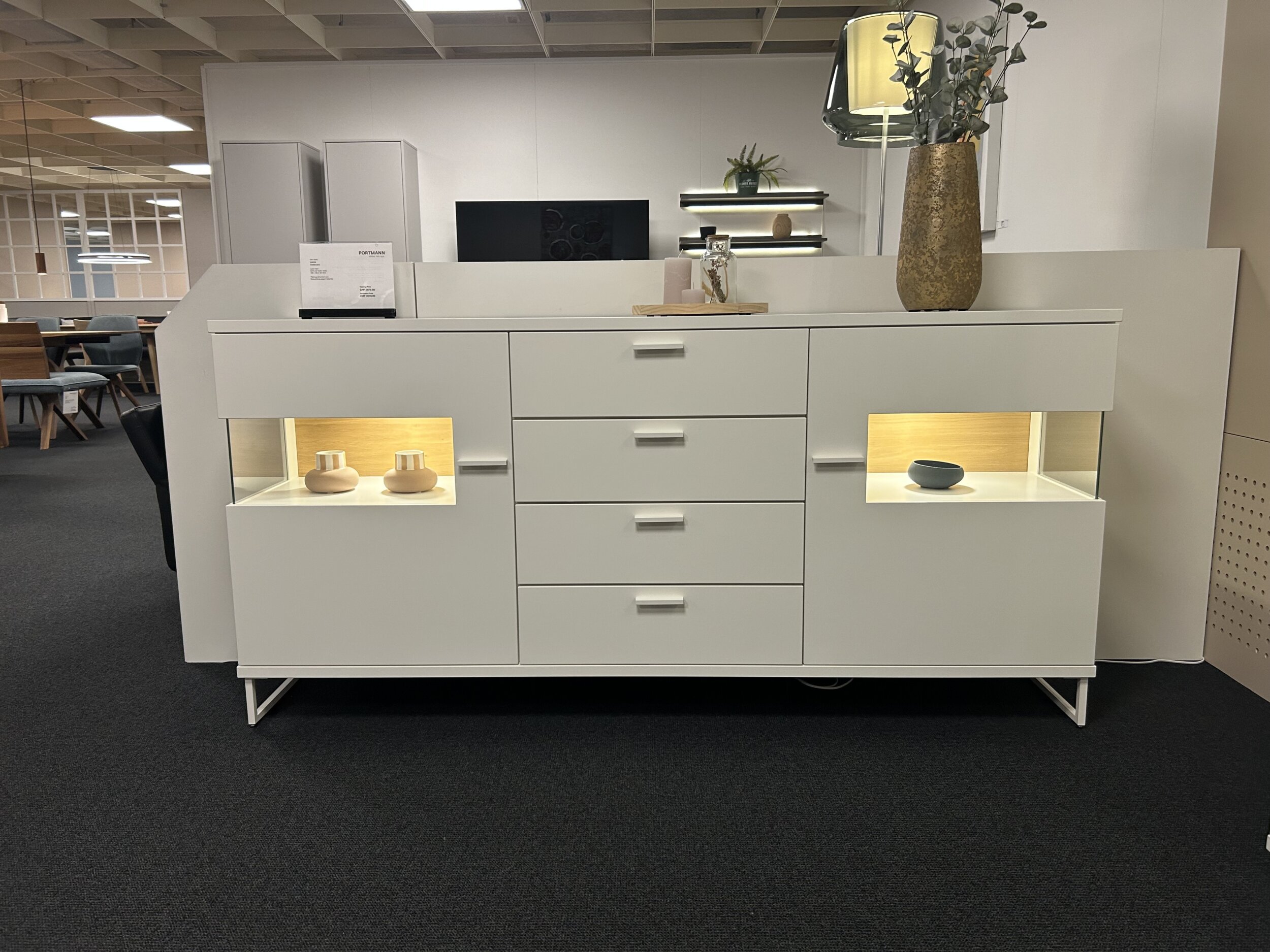 Sideboard in Lack matt weiss, Nischen mit Rückwand Eiche sand furniert, 2 Türen, 4 Schubladen, mit Griffen, inkl. Beleuchtung (ohne Garantie), B 180 x T 39.6 / H 87.3cm