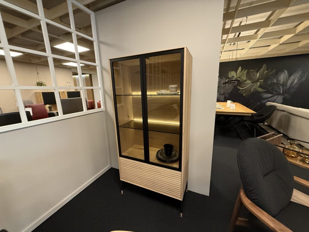 Highboard in Ast-Eiche massiv weiss geölt gebürstet (Quercus robur/Europa), 2 Türen Parsolglas braun, 2 Schubladen mit Rillenfräsung, Metallgestell schwarzgrau matt, grifflos, inkl. Beleuchtung (ohne Garantie), B 80 x T 39 / H 166.6 cm