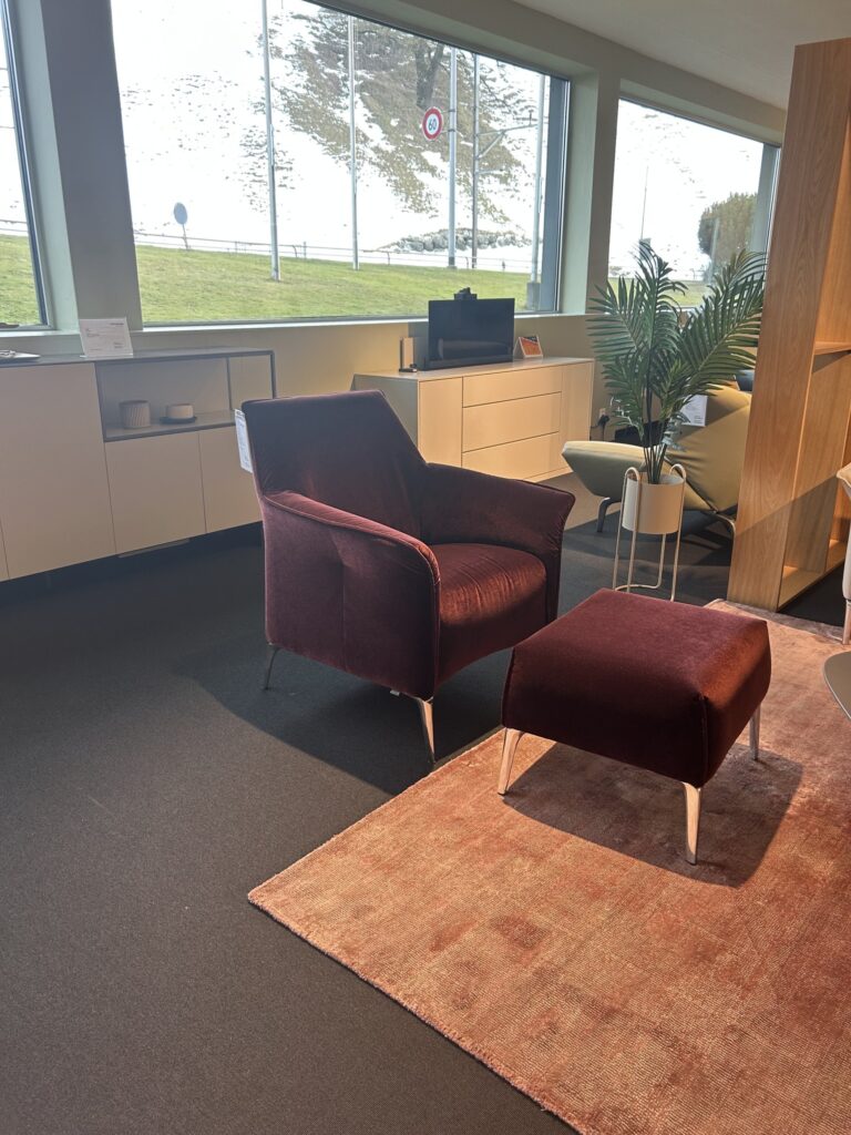 Sessel mit Hocker in Stoff burgundy, Füsse Aluminium poliert, 1x Sessel, B 73 x T 74 / H 84 cm, 1x Hocker, B 57 x T 52 / H 42 cm