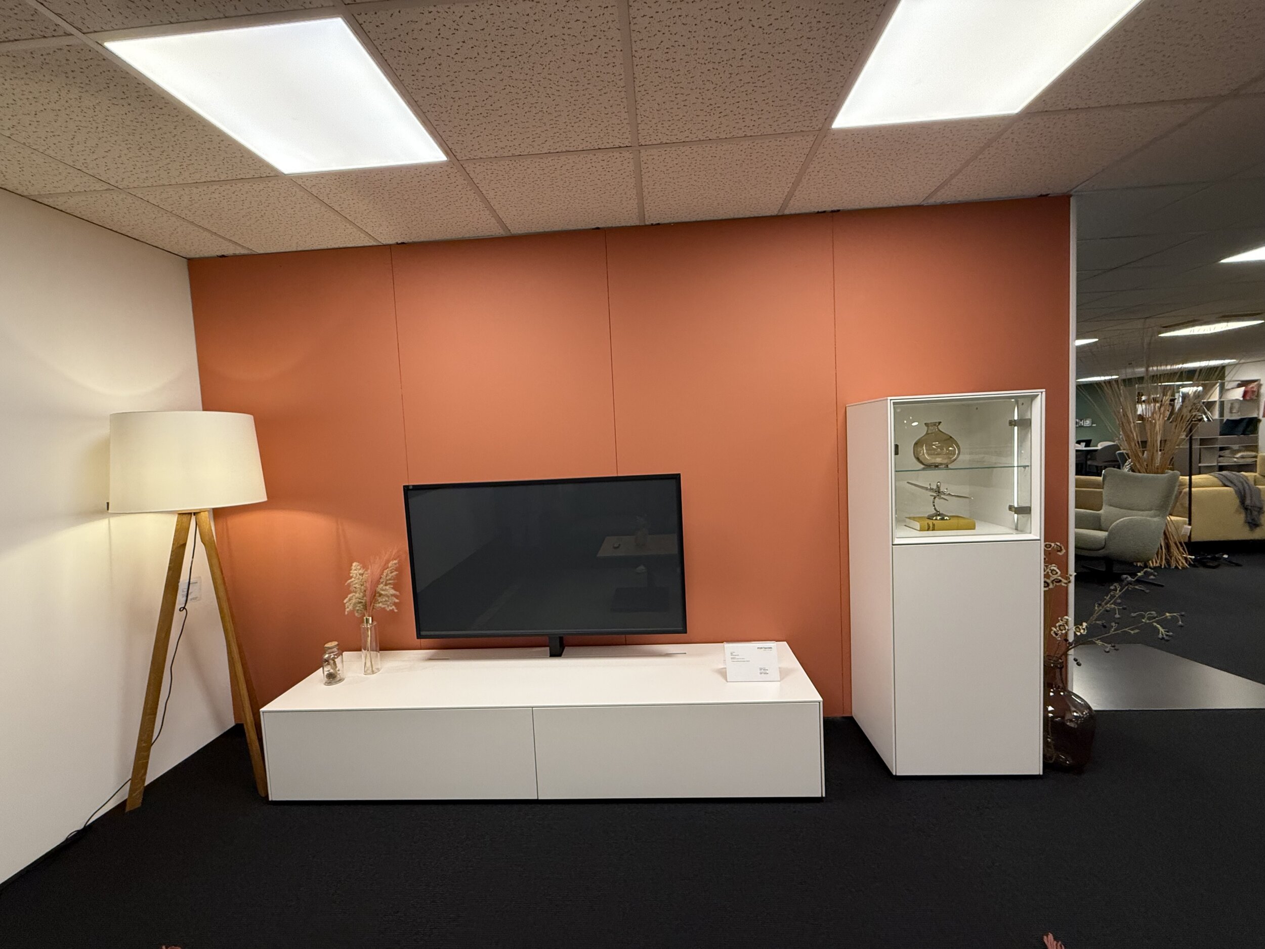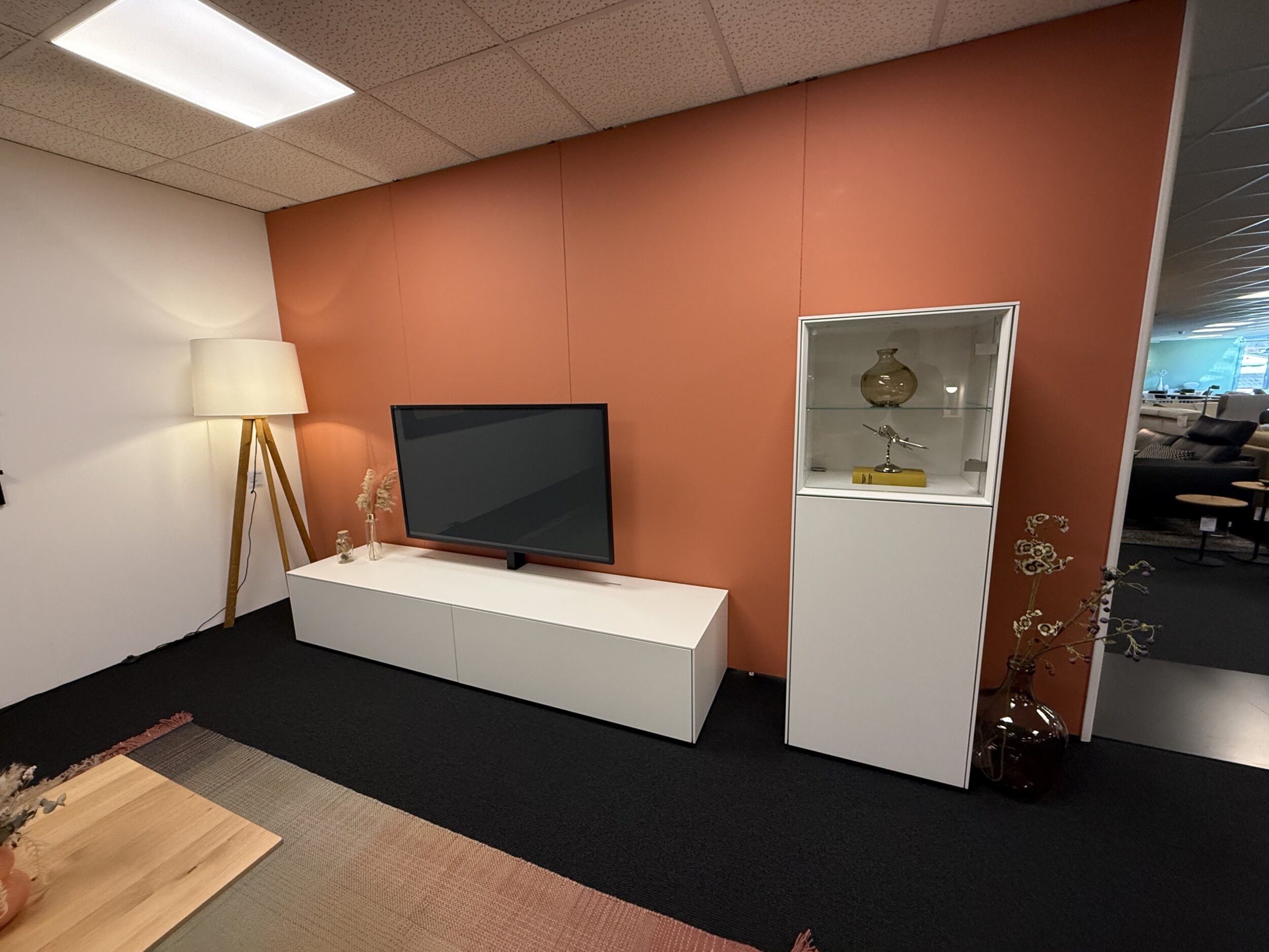 Wohnprogramm in reinweiss decklackiert, grifflos, inkl. Beleuchtung (ohne Garantie), Lowboard B 218 x T 43.1 / H 39.6 cm / Vitrine B 56 x T 43.1 / H 150 cm, Stellmass ca. B 290 x T 54 / H 150 cm