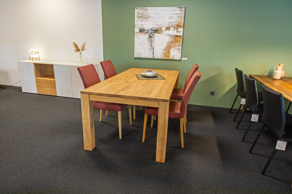 Tisch in astige Eiche geölt, braun pigmentiert (Quercus/Polen), Plattenstärke 28 mm, Fuss 10 x 10 cm, 2 Klappeinlagen à 50 cm, B 100 x T 220 – 270 – 320 / H 76 cm