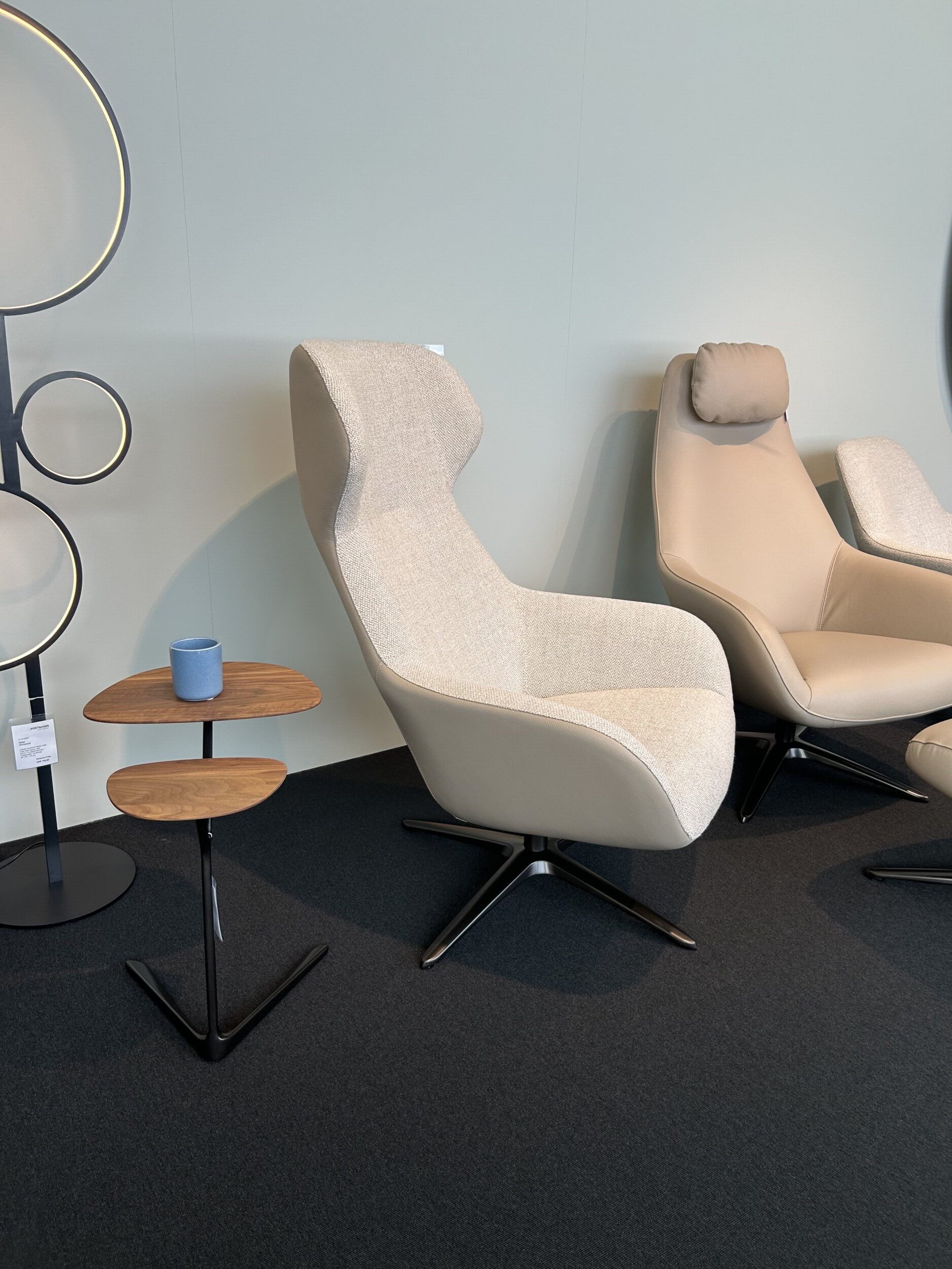 Sessel mit Innenseite in Stoff gravel, Aussenseite in Echtleder beige, Sternfuss Epoxy schwarz, Sitzhöhe 44 cm / Sitztiefe 53 cm, B 75 x T 80 / H 109 cm