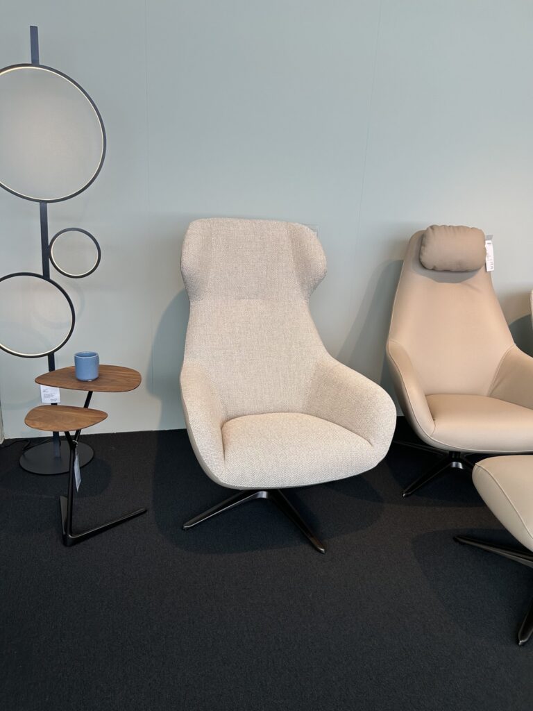 Sessel mit Innenseite in Stoff gravel, Aussenseite in Echtleder beige, Sternfuss Epoxy schwarz, Sitzhöhe 44 cm / Sitztiefe 53 cm, B 75 x T 80 / H 109 cm