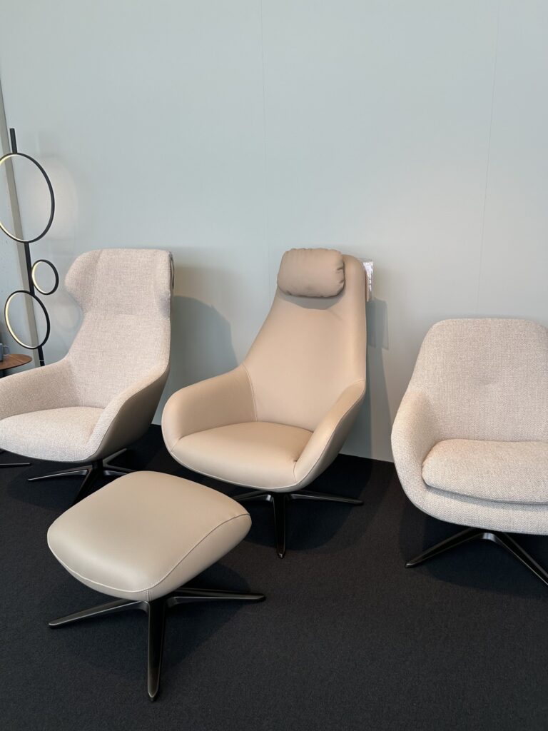 Sessel mit Kopfstütze in Echtleder beige, Sternfuss Epoxy schwarz, Sitzhöhe 42 cm / Sitztiefe 53 cm, B 75 x T 80 / H 106 cm, inkl. Hocker B 55 x T 54 / H 42 cm
