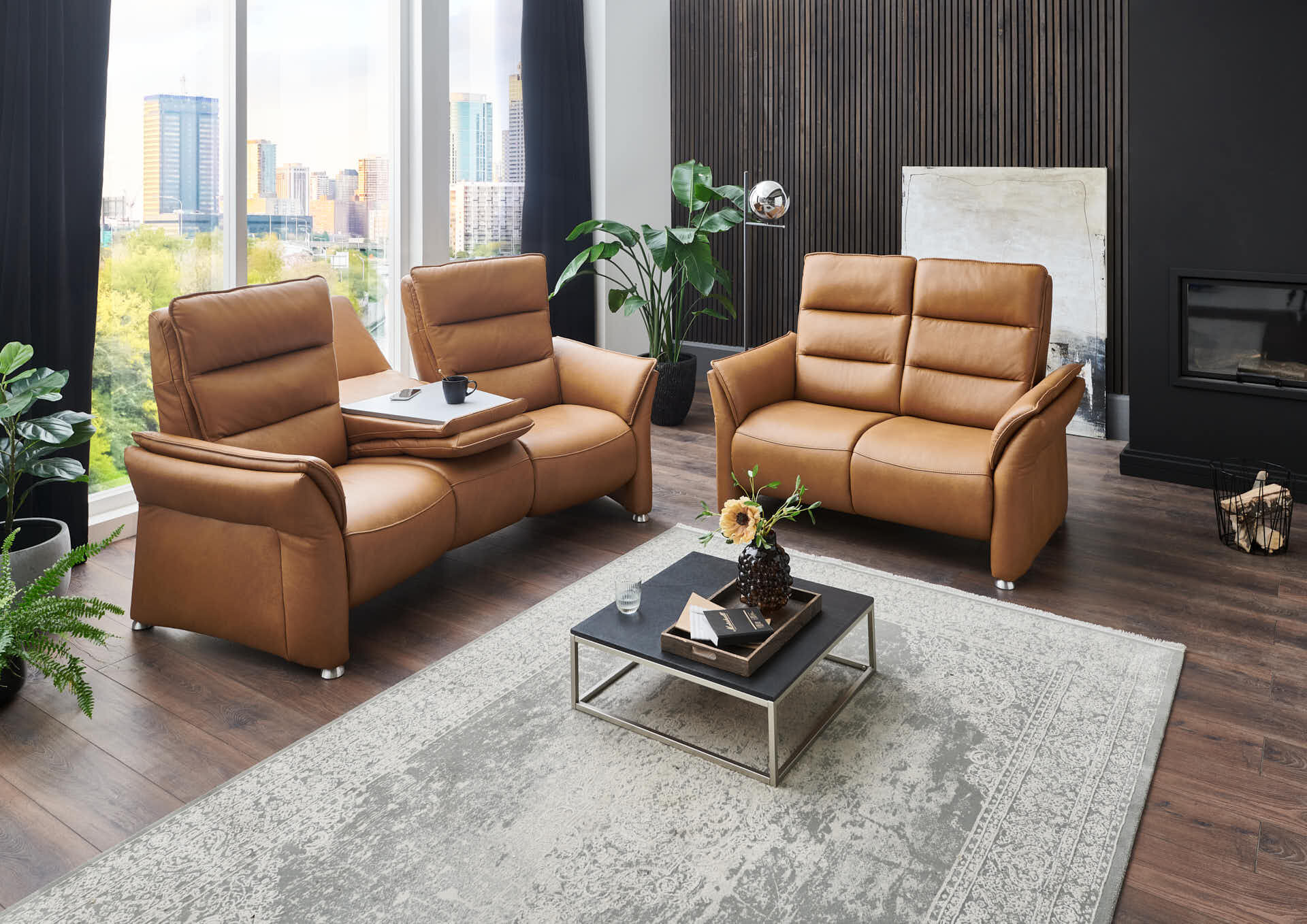 Sofa wahlweise in Stoff oder Echtleder, optional als Sessel, mit Relaxfunktion und herausklappbarer Tischablage, B 202 x T 103 / H 115 cm